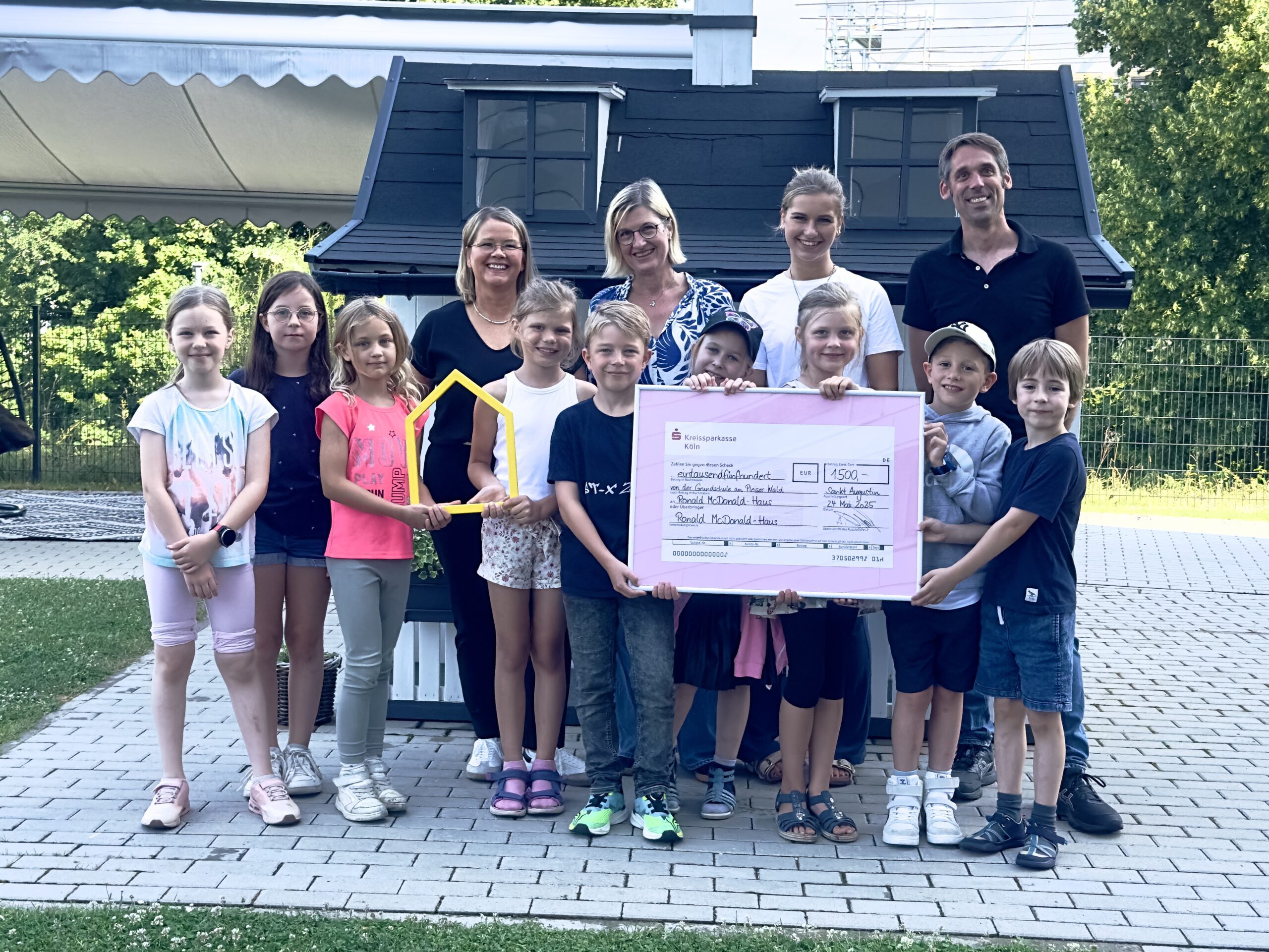 26.06.2025 – Es war ihnen ein Herzensanliegen: Die Kinder der Grundschule Am Pleiser Wald haben den kompletten Erlös aus ihrem Sommerfest an das Ronald McDonald-Haus in Sankt Augustin gespendet. Am Donnerstag durfte ein kleine Schüler*innen-Gruppe, begleitet von Schulleiter Alexander Diel und Lehrerin Sabine Brockmann, stellvertretend für die ganze Schulfamilie den großen Scheck überreichen.