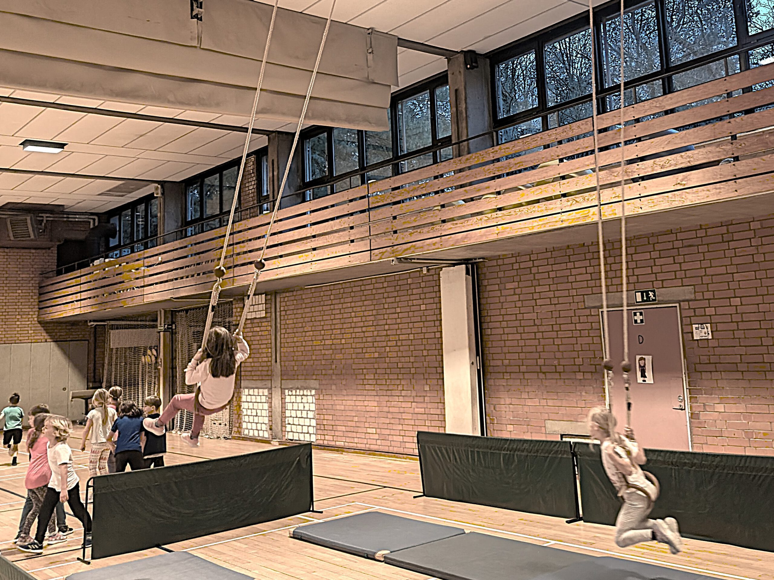 Mit wievel Anlauf schaffe ich es, den steilen Berg aus einer Weichbodenmatte zu erklimmen? Wieviel Schwung brauche ich, um am langen Seil die tiefe Kluft zu überwinden? Schaffe ich es, bis zu drei Meter hoch zu klettern, ohne schwindelig zu werden? Solche Herausforgerungen galt es für unsere Zweitklässler zu meistern. Und sie haben es meisterhaft gemacht. Bei zahlreichen außergewöhnlichen Bewegungsaufgaben haben sie gelernt, sich selbst und das gestellte Risiko einzuschätzen, sie haben sich selbst überwunden und Neues gewagt und sie sind dabei über sich hinausgewachsen. Belohnt wurden sie unmittelbar mit ihrem eigenen Erfolg sowie mit großem Stolz, Großes geschafft zu haben, woran sie selbst vorher gar nicht geglaubt hätten.