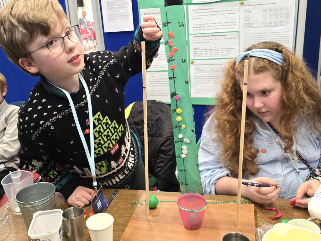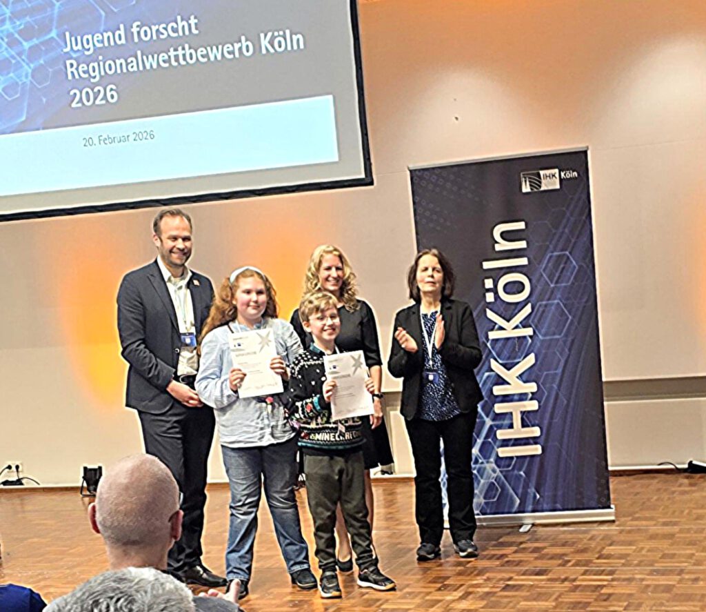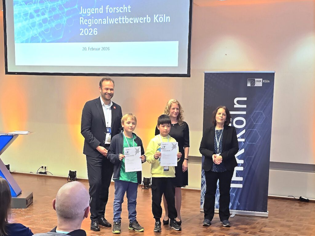 20.02.2026 – Zum ersten Mal haben Schülerinnen und Schüler der Grundschule am Pleiser Wald am Regionalwettbewerb Köln von „Jugend forscht“ teilgenommen. Am vergangenen Freitag sind Franziska und Christopher aus der Fröscheklasse (4a) sowie Jonas und Leon aus der Giraffenklasse (4c) mit ihren von langer Hand geplanten Projekten gegen 24 weitere Bewerber in den Räumen der IHK Köln angetreten. Präsentiert haben sie ein Katapult, mit dem man Tischtennisbälle fast zwei Meter hoch in die Luft schleudern kann, sowie einen Landsegler, ein Fahrzeug, das sich ausschließlich mit Windkraft bewegt. Die Aufregung war groß, denn die vier kleinen Forscher*innen mussten nicht nur ihre Werke vorstellen, sondern auch einen kurzen Vortag über ihre Arbeit halten und den Forscherprozess mit Plakaten visualisieren. Die strenge Jury bestand aus versierten Naturwissenschaftlern, die genau hinsahen. Außerdem befanden sich unsere Forscher*innen in illustrer Gesellschaft, denn sie waren die jüngsten und traten ausschließlich gegen Schüler*innen verschiedener Kölner Gymnasien an. Was für eine Ehre!