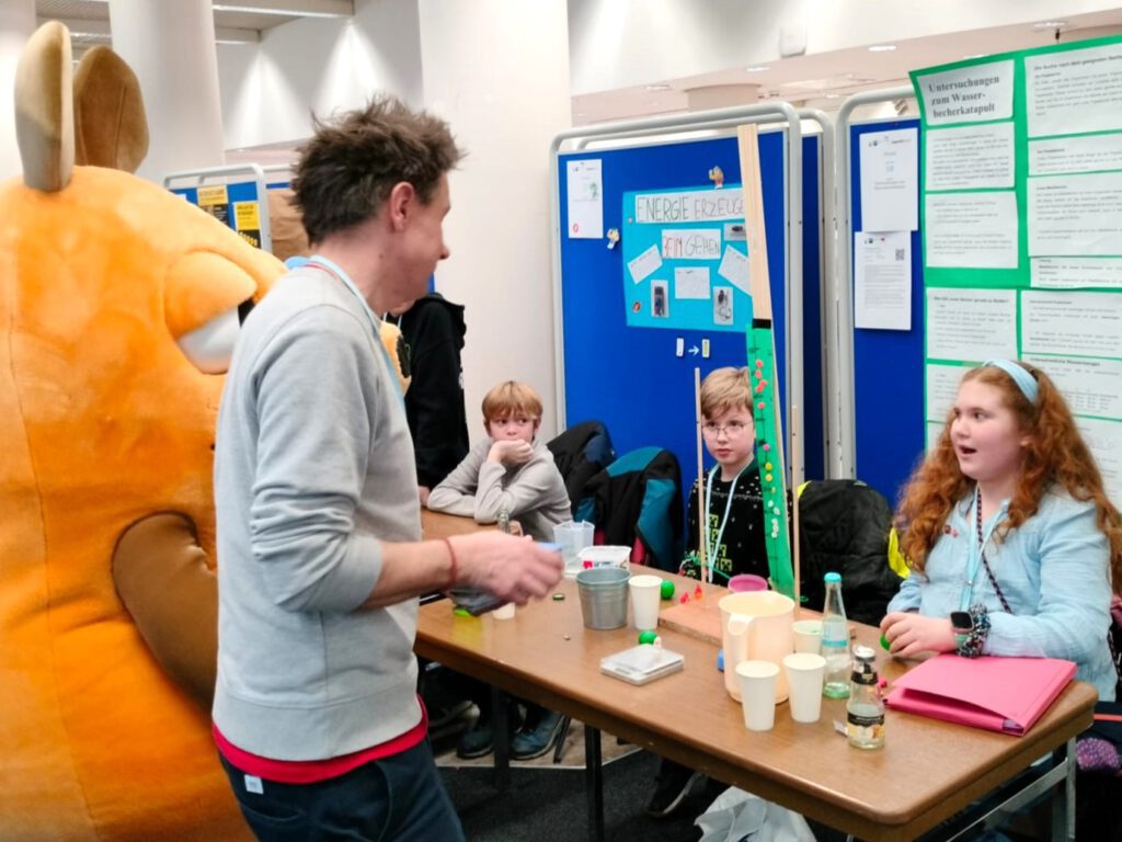 Doch damit nicht genug. Kaum, dass sie ihre Präsentationen über die Bühne gebracht haben, erschien bereits hoher Besuch an den Ausstellungsständen der Grundschüler*innen: Die WDR-Maus war da und wollte sich höchstpersönlich über die Funktionsweise von Katapult und Landsegler informieren. Klar – der Maus erklärt man doch gerne noch einmal, wie die Forscherprojekte vom Pleiser Wald funktionieren! Und das umso begeisterter, hatte sie doch ihr orangefarbenes Mikrofon dabei, mit dem sie die Erläuterungen für den nächsten Maus-Podcast aufgenommen hat. So wird die ganze Mühe also zusätzlich mit der entsprechenden Publicity geadelt.