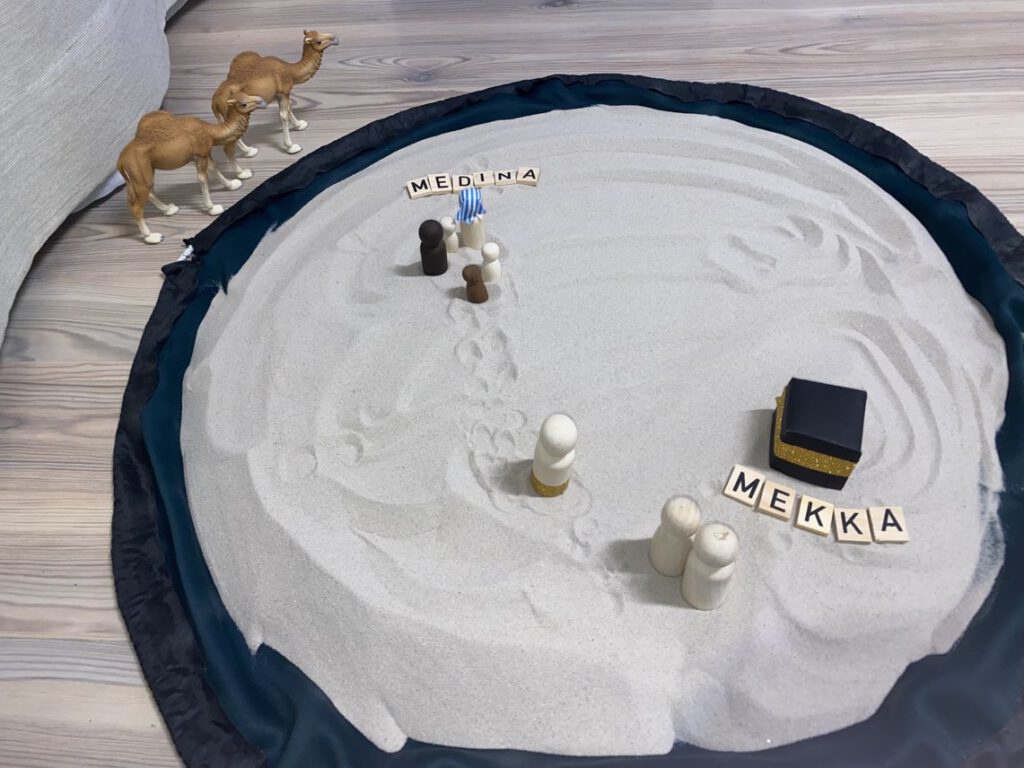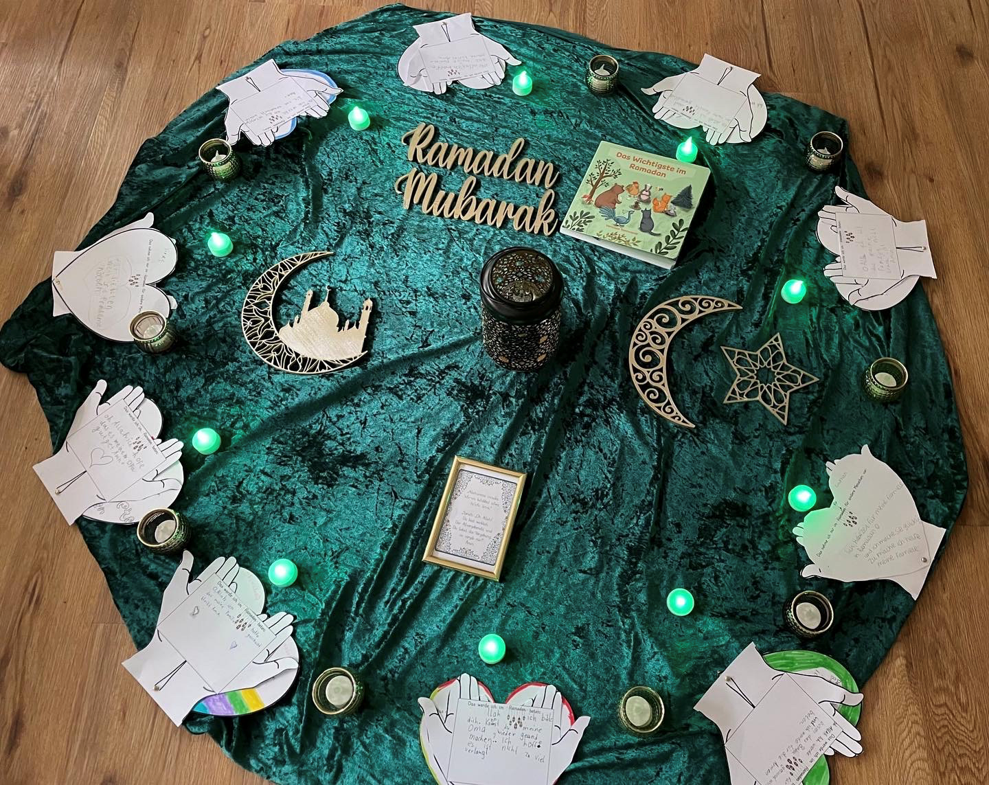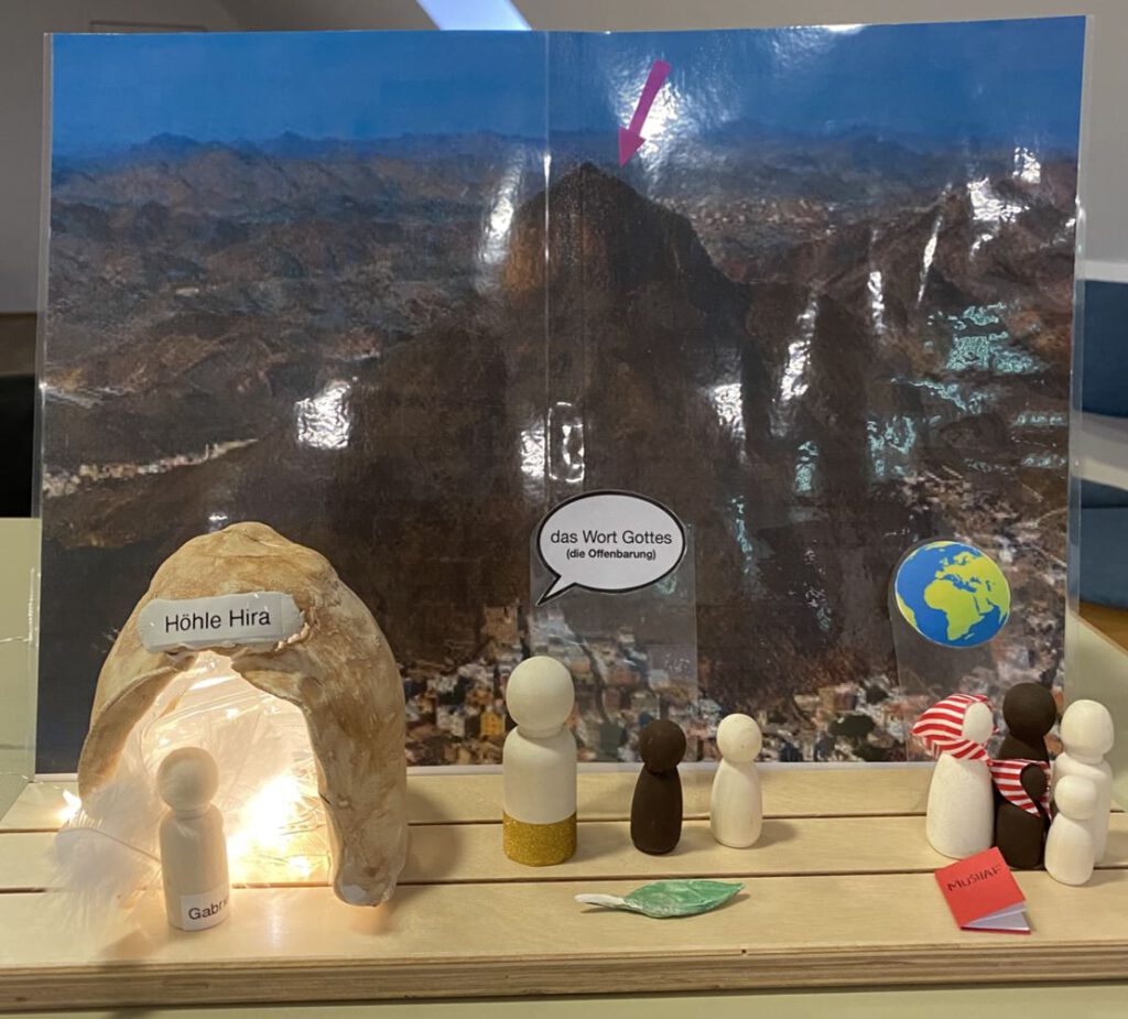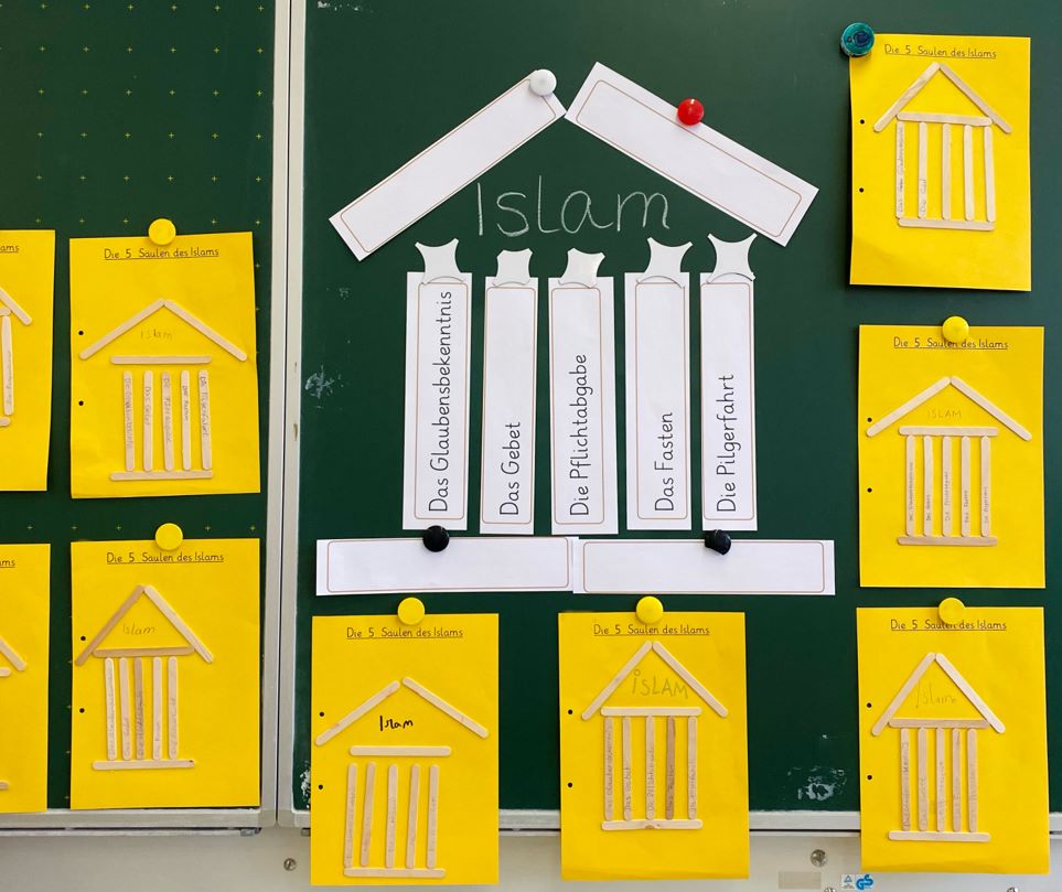 Zum Beispiel werden die fünf Säulen des Islam von den Kindern mit Holzstäbchen nachgebaut, Bittgebete und Vorsätze für den Ramadanmonat werden in Form eines Bodenbildes gesammelt oder die Entstehungsgeschichte des Koran wird im Spiel mit Holzfiguren lebendig.