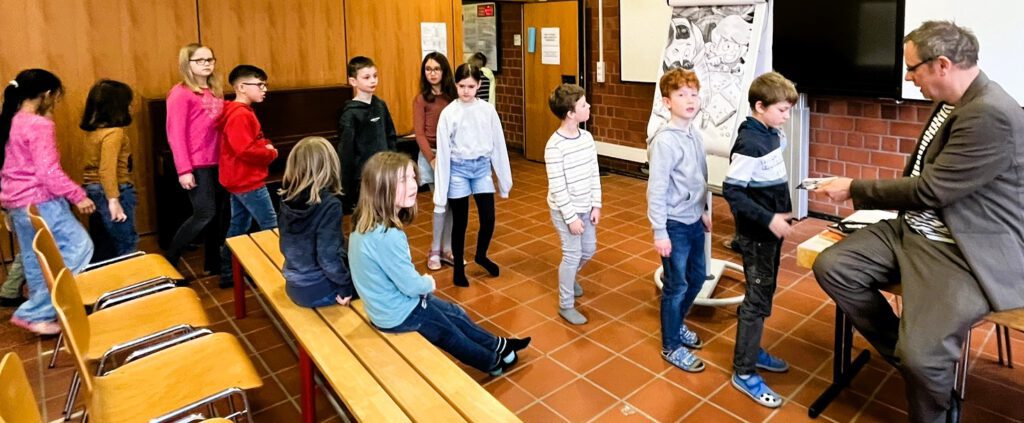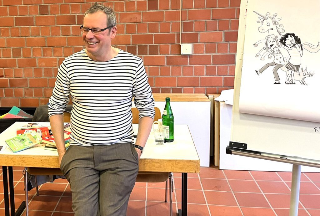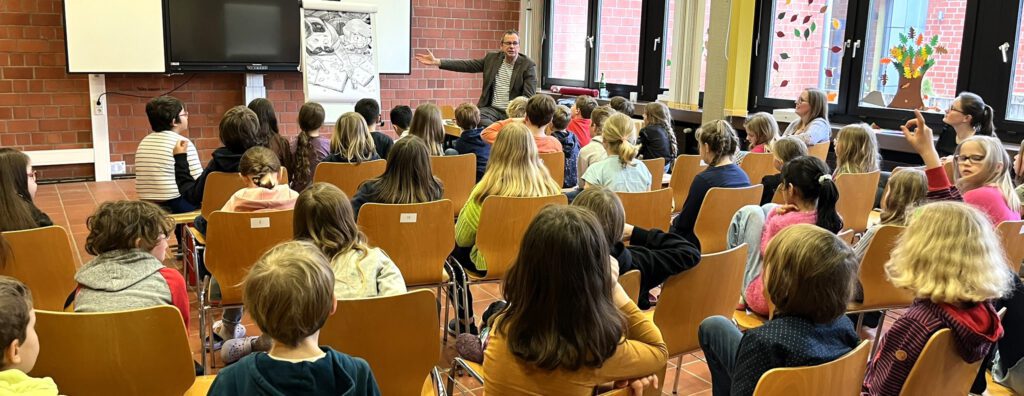 13.03.2024 – Der Kinderbuchautor Rüdiger Bertram ist ein Garant für gute Laune. Am Dienstag und Mittwoch war er zu Gast in unserer Schule und hat aus seinen Büchern vorgelesen. Ohne Mühe entführte er die Dritt- und Viertklässler:innen in seine Welten, in denen es vor schüchternen Superhelden, arroganten Einhörnern und liebenswerten Stinktieren nur so wimmelt. Und die Kinder dankten es ihm mit ihrer ganzen Aufmerksamkeit. Von zahlreichen gespannten Gesichtern, herzlichem Lachen und großem Applaus waren seine Vorlesestunden geprägt. „Nein, ich bin nicht hier, um für meine Bücher zu werben“, betont er am Rande der Autorenlesung. „Ich mache hier klassische Leseförderung. Kinder, denen vorgelesen wird, greifen gerne auch mal selbst zum Buch und vertiefen sich in wunderbare Fantasiewelten.“