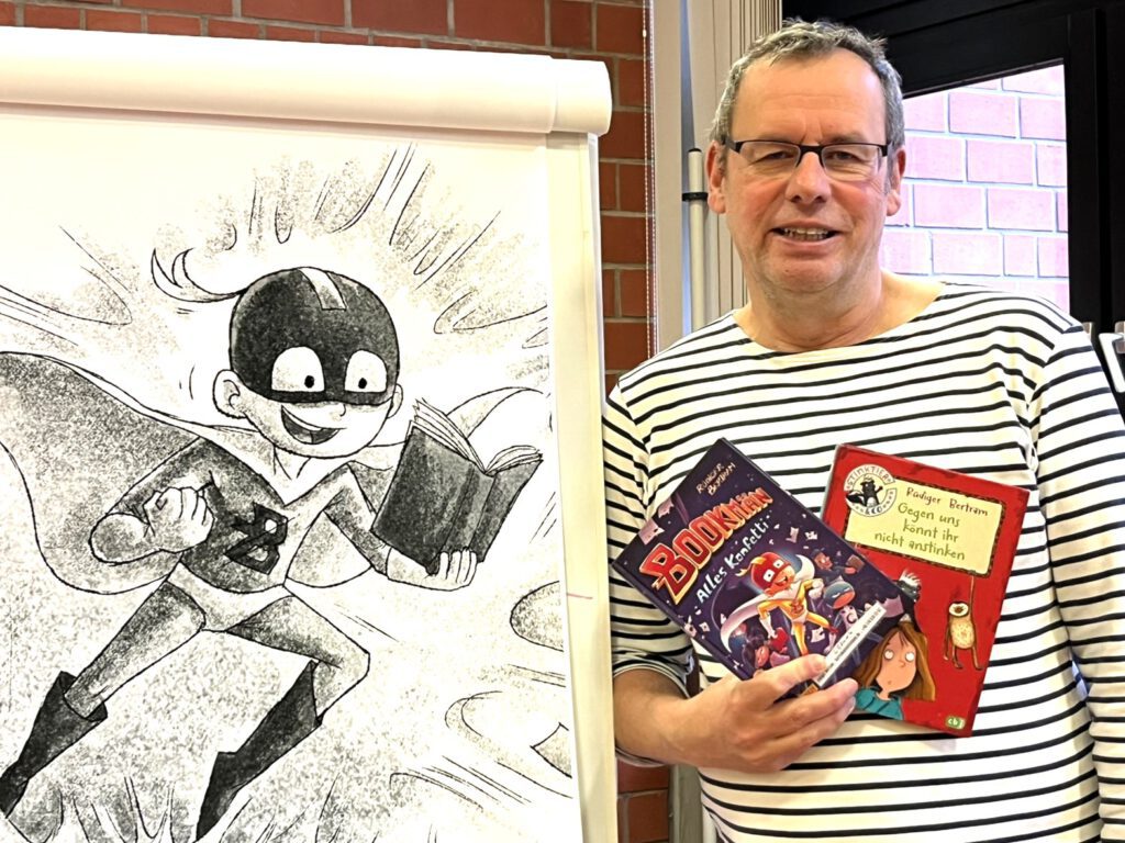 Die Bände „Gegen uns könnt ihr nicht anstinken“ aus der „Stinktier & Co“-Reihe sowie „Alles Konfetti“ aus der „Bookmän“-Reihe bildeten das Zentrum der der Vorlese-Stunden. Doch damit nicht genug. Im Anschluss an seine Lesungen beantwortete Bertram unzählige Fragen, die die Kinder an ihn und seinen Beruf als Buchautor hatten: „Wie kommst du auf deine Ideen?“, „Was machst du, wenn dir mal nichts einfällt?“, „Was verdienst du eigentlich als Buchautor?“ und viele weitere Fragen beantwortete er geduldig und trat so in den intensiven Dialog mit seinen Zuhörer:innen. „Ich habe auch schon angefangen, ein Buch zu schreiben, aber im Moment weiß ich nicht, wie es weitergehen soll“, berichtete eine Drittklässlerin. „Das kenne ich auch“, so die Erfahrung des erfahrenen Schreib-Profis. „Lass es einfach mal ein paar Tage liegen. Die zündende Idee kommt garantiert. Bleib in jedem Fall dran!“