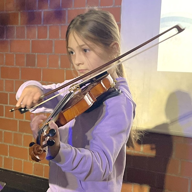 Esma aus der Giraffenklasse (4c) mit der Geige: Respekt vor dieser großen Leistung!