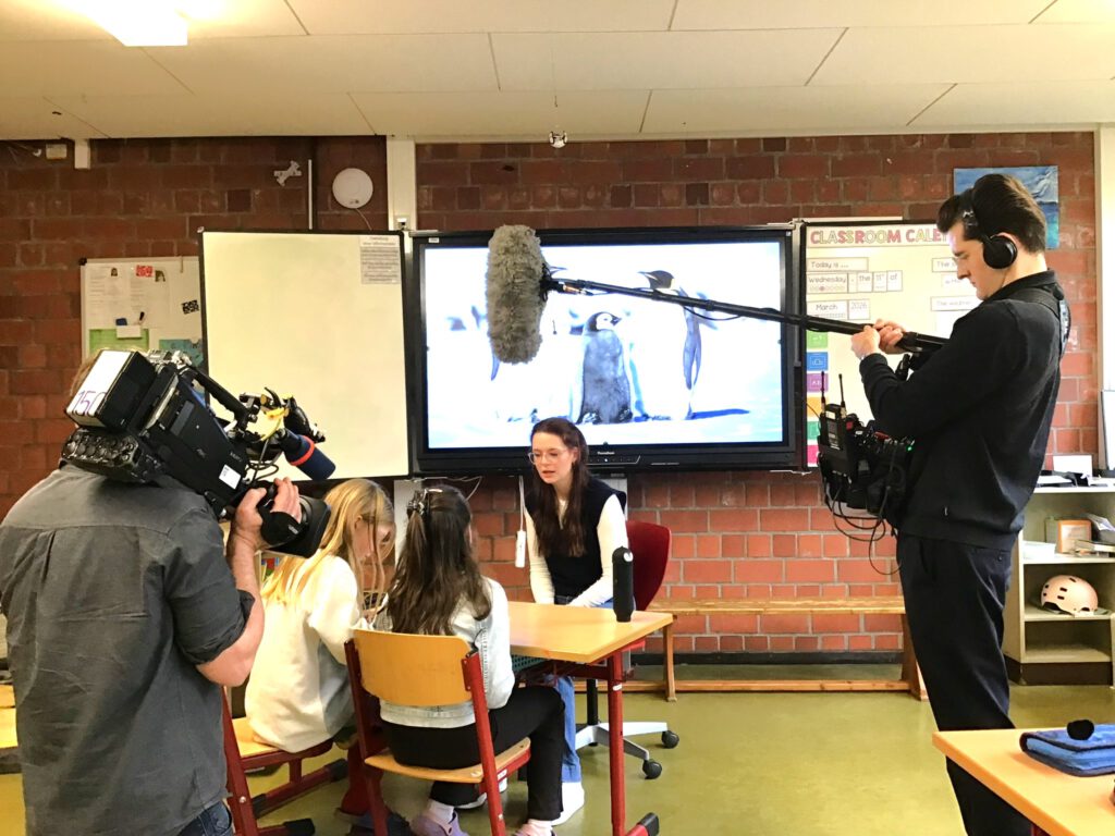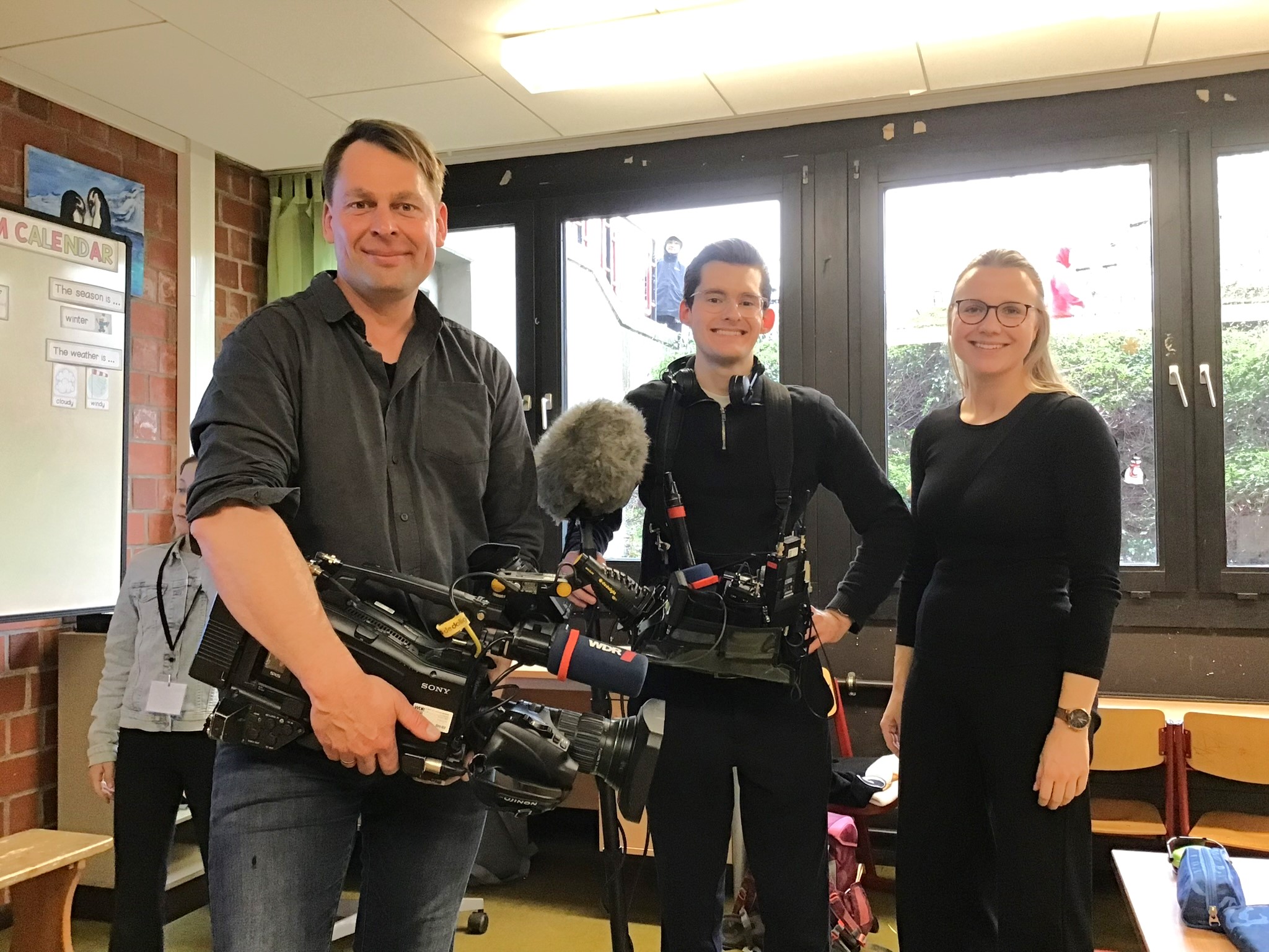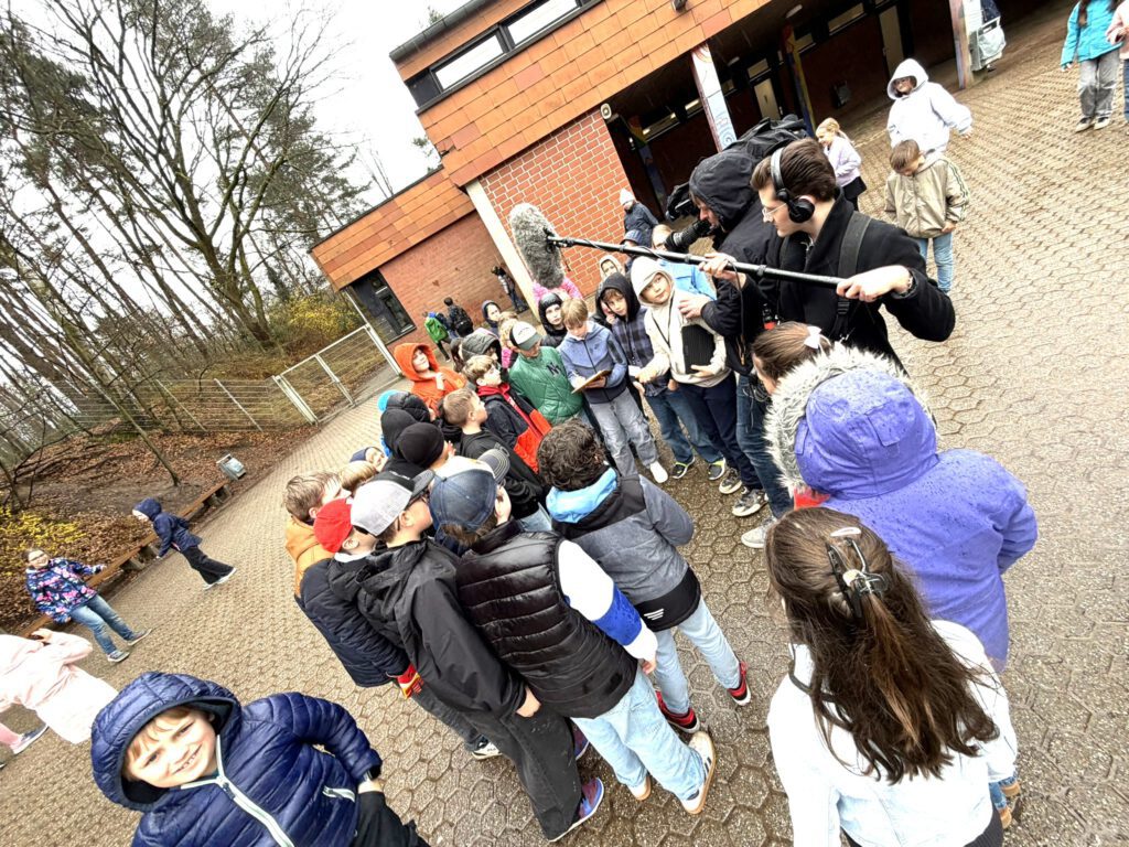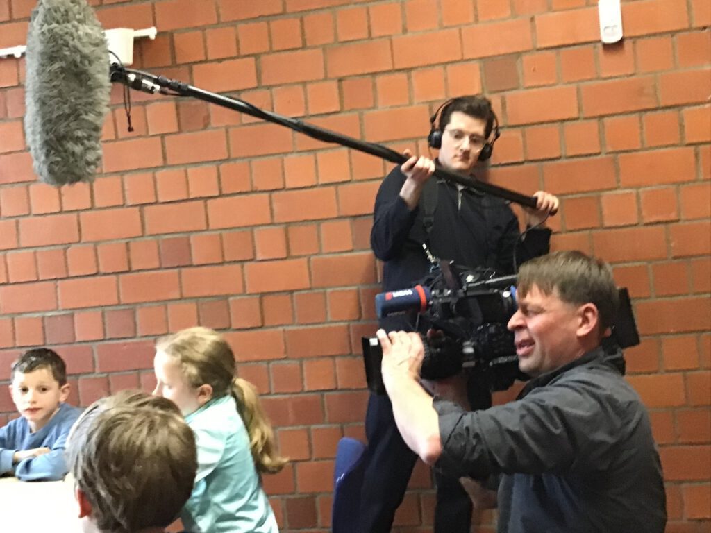 Das Team vom WDR, also Stefan, der Kameramann, Sören mit dem großen Mikrofon und Paula, die uns viele Fragen gestellt hat, ist uns immer hinterhergelaufen. Paula hat ganz oft gesagt: „Das müssen wir nochmal machen. Könnt ihr nochmal hier entlang gehen?“ oder „Könnt ihr nochmal eine Interviewfrage stellen?“ Und dann hat Stefan nochmal von der anderen Seite gefilmt und Sören kam hinterher und hat das Mikrofon mit dem Puschel über uns gehalten. Das hat oft richtig lang gedauert und war sehr anstrengend. Es ist ganz schön schwierig so zu tun, als ob die Kamera gar nicht da ist, denn es soll ja ganz normal wie immer aussehen. Manchmal muss man eben doch in Richtung Kamera spingsen. Immer, wenn man etwas sagen musste, kam so ein Kribbeln im Bauch wegen der Aufregung und weil man ja nicht weiß, ob das jetzt wirklich gut war. Aber die drei waren super nett und wenn man sich versprochen hat, konnte man nochmal von vorne anfangen. Die können die Fehler ja einfach rausschneiden.