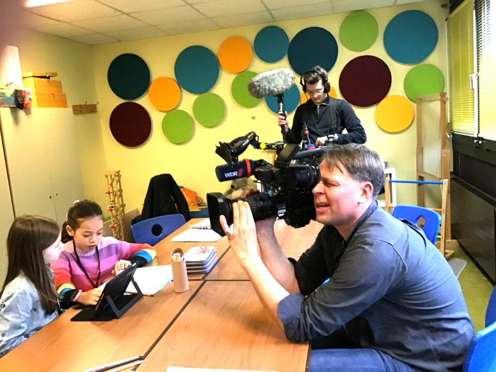 Die haben gefilmt, wie Daria und Anna Frau Eichert interviewt haben und wie Antonia und Rabea das Treffen mit den Schülersprechern hatten. Außerdem waren sie dabei wie Leni und Daria die Seitenplanung gemacht haben und wie Vicky und Emilia das Interview mit Herrn Bongartz in das Tablet eingesprochen haben. Am Ende waren wir alle auf dem Schulhof und Stefan hat gefilmt wie Benedict, Tim und Kai die Umfrage mit den Fußball-Jungs gemacht haben. Das war richtig schwierig. Es hat die ganze Zeit geregnet und auf dem Schulhof war es richtig laut, weil so viele Kinder neugierig waren und dabei sein wollten. Deshalb hat das auch ewig lang gedauert, weil das Team vom WDR immer wieder von vorne anfangen musste.