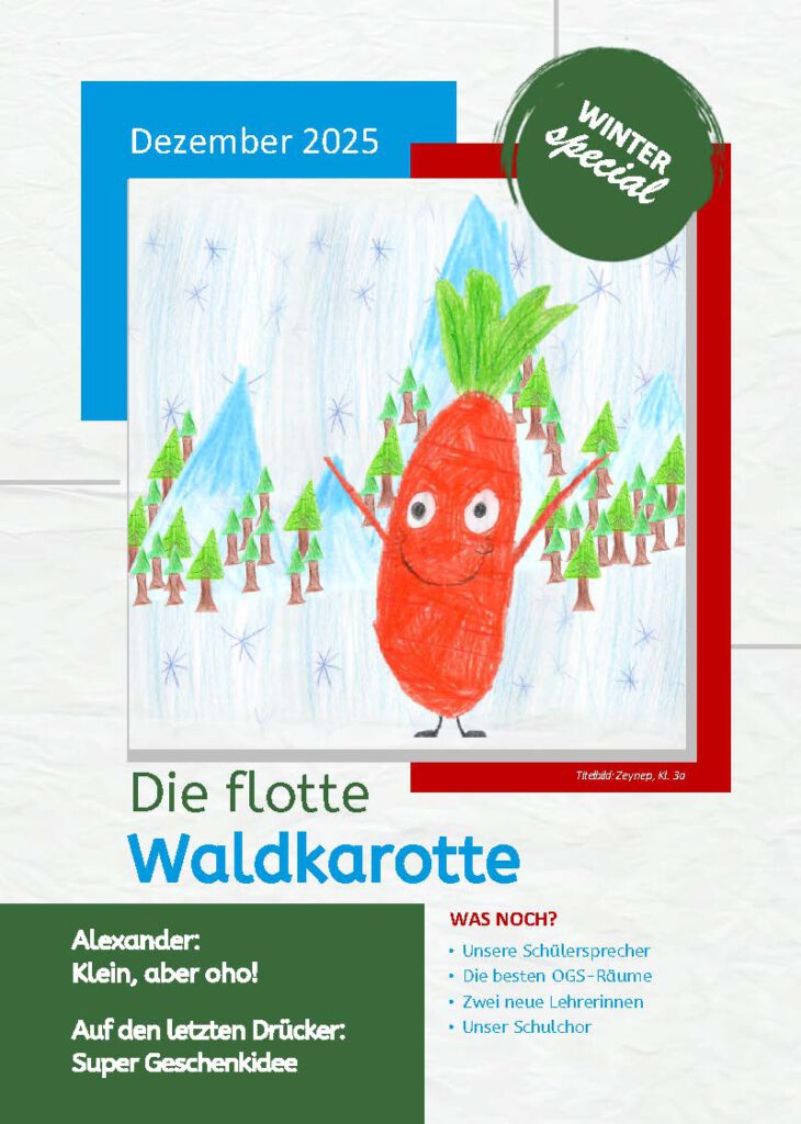 Die Flotte Waldkarotte ist unsere bunte Schülerzeitung, die von einem Team aus Reporter*innen, Redakteur*innen und Grafiker*innen aus den Jahrgangsstufen 3 und 4 gestaltet wird. In jeder Ausgabe gibt es viel Neues aus unserem Schulleben, interessante Artikel, Hintergrundberichte, Interviews und Kommentare, die persönlich von den Kindern recherchiert, getextet, fotografiert und gestaltet werden. Natürlich fehlt auch nicht das Salz in der Suppe – die Rätsel, Witze und Comics, die zum Lachen und Mitmachen anregen.