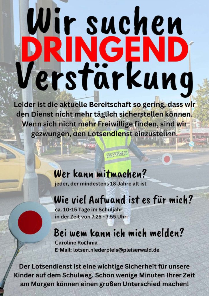 Wenn Sie mithelfen wollen, melden Sie sich gerne bei der Koordinatorin für die Schülerlotsen, Caroline Rochnia: Tel: 0177-6428895 oder E-Mail: lotsen.niederpleis@pleiserwald.de.